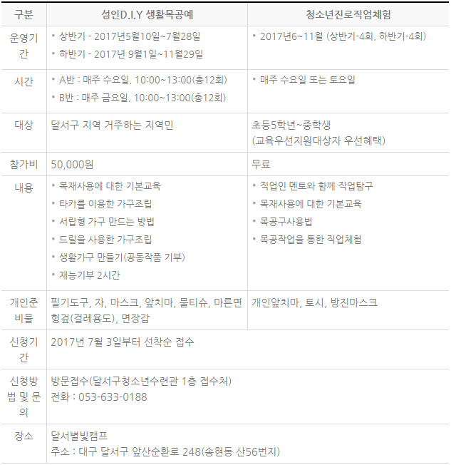 달서구 지역주민의 문화예술적 역량을 키우고, 주민들간 소통의 기회를 제공하므로써, 지역공동체문화형성에 중요한 역할을 하고, 청소년들의 다양한 진로직업체험의 기회를 제공하고자, 뚝딱뚝딱 공작소 참가자를 다음과 같이 모집합니다.